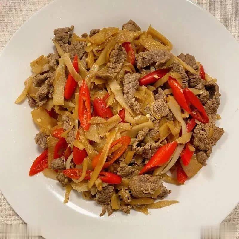 准备食材: 冬笋、牛肉、姜丝、蒜末、青椒丝。